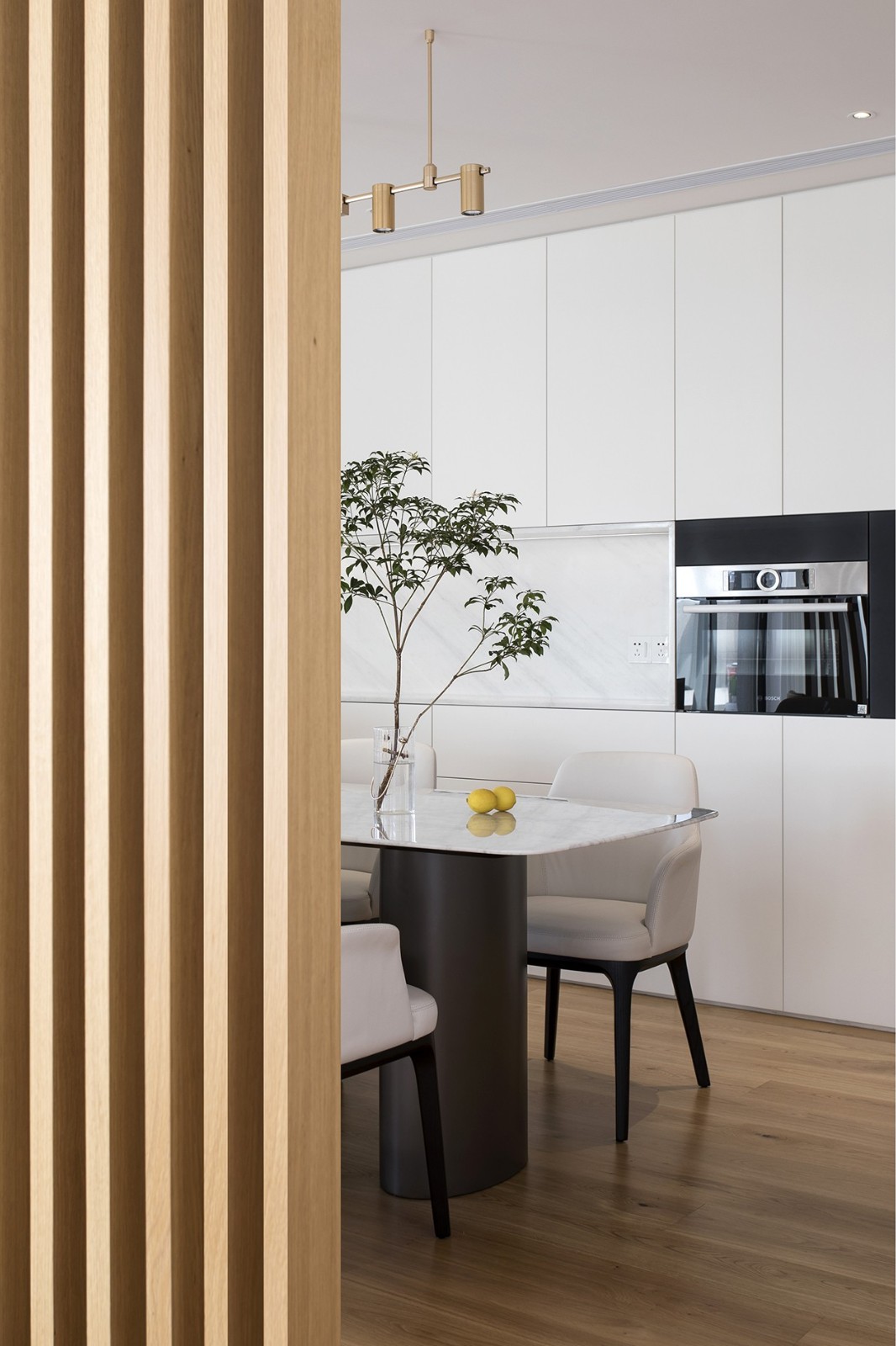 阳光与空气洒入空间,充满了艺术的感染力,真实与诗意在不经意间流露,木饰面包裹的窗框,犹如一个城市画框,打开百叶帘把城市的景观引入室内。