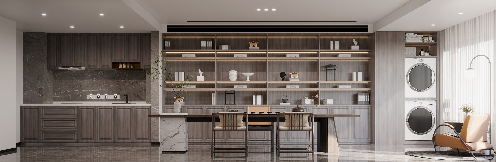 客厅采用无主灯极简吊顶设计,书柜满铺,配合大书桌台,整体沉稳大气简洁舒适。