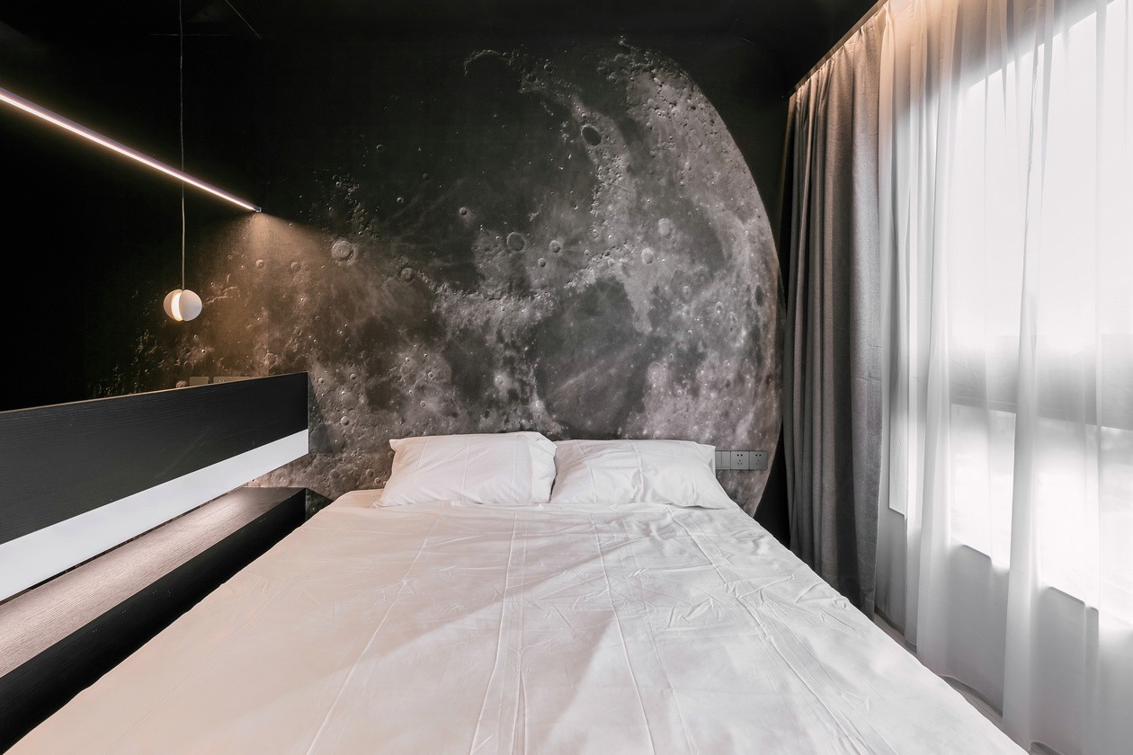 卧室地台与床架的几何结构,设计感十足又无比实用,下挂的书桌侧面的白色挡板,可以隐藏凌乱的桌面。星球背景墙和球形灯颇有些登陆月球的既视感,作为卧室空间新潮又有趣,中性气质满满。