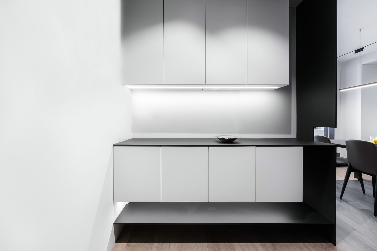 入户玄关正对的玄关柜一键到顶 黑色铁艺层板构成的几何体悬浮设计 嵌入质感***的白色烤漆柜体 一黑一白,在视觉上形成强烈对比