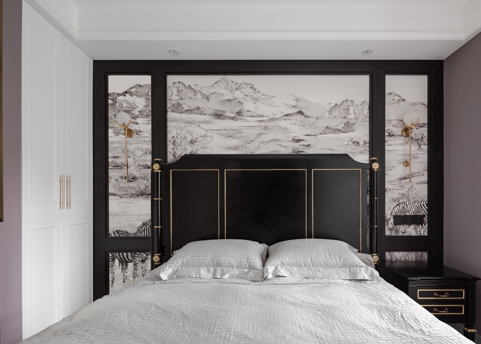 追求复古的经典,又不失文化古韵感,黑框与白灰西洋壁画表现疏朗感,屋檐造型的床靠背将中西文化相互融合;因此,对于主卧,设计师更强调居者与空间、物品的关系及其所蕴含的意义和情绪