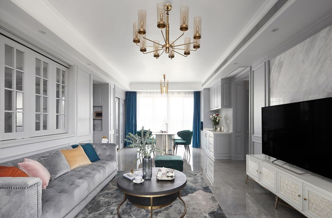 主基调素雅的空间里,用恰到好处的软装色彩提亮整体的明亮度,丰富视觉层、黄铜元素大理石背景墙软装互相谢天,呈现简约大气却饱含致敬韵味的空间,
