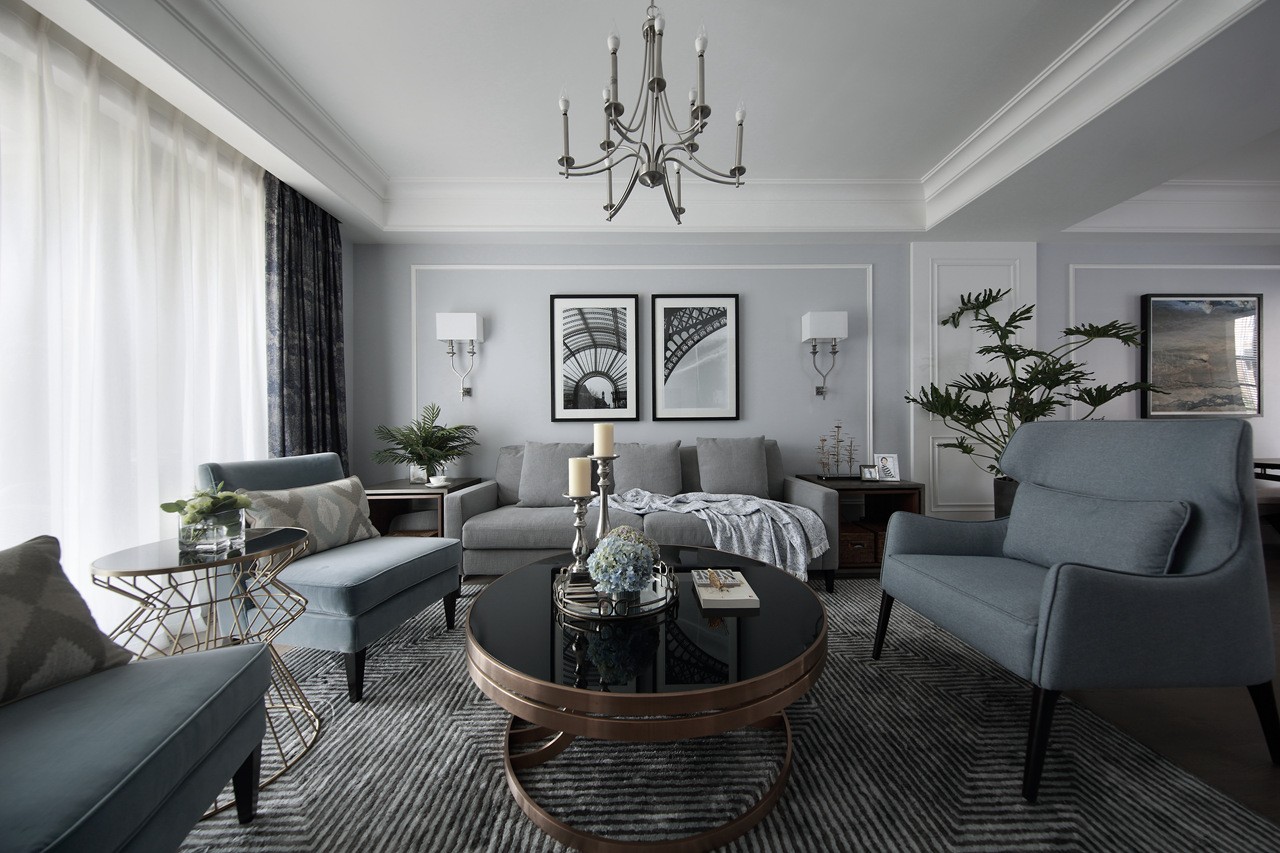轻轻浅浅的灰色空间里,造型优美的沙发与极具现代风格的金属茶几巧妙并置融合,让空间尽显高贵和雅致。 两幅建筑摄影作品的挂画让整个空间更具视觉穿透感,同时也刻画出了更强的空间立体感。