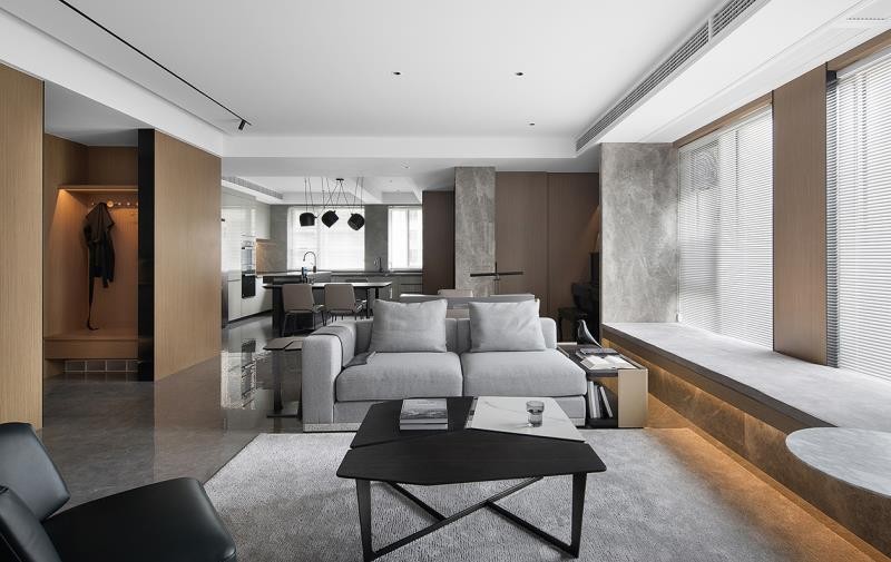 关于门厅及烹饪区的处理,可能更多的还是围绕日常的便捷可操作性为主,居住者本身在这样的分区内可以被记录更多的日常,借由柜体的延伸及天花连贯性,引导行为走动到过道及就餐区。