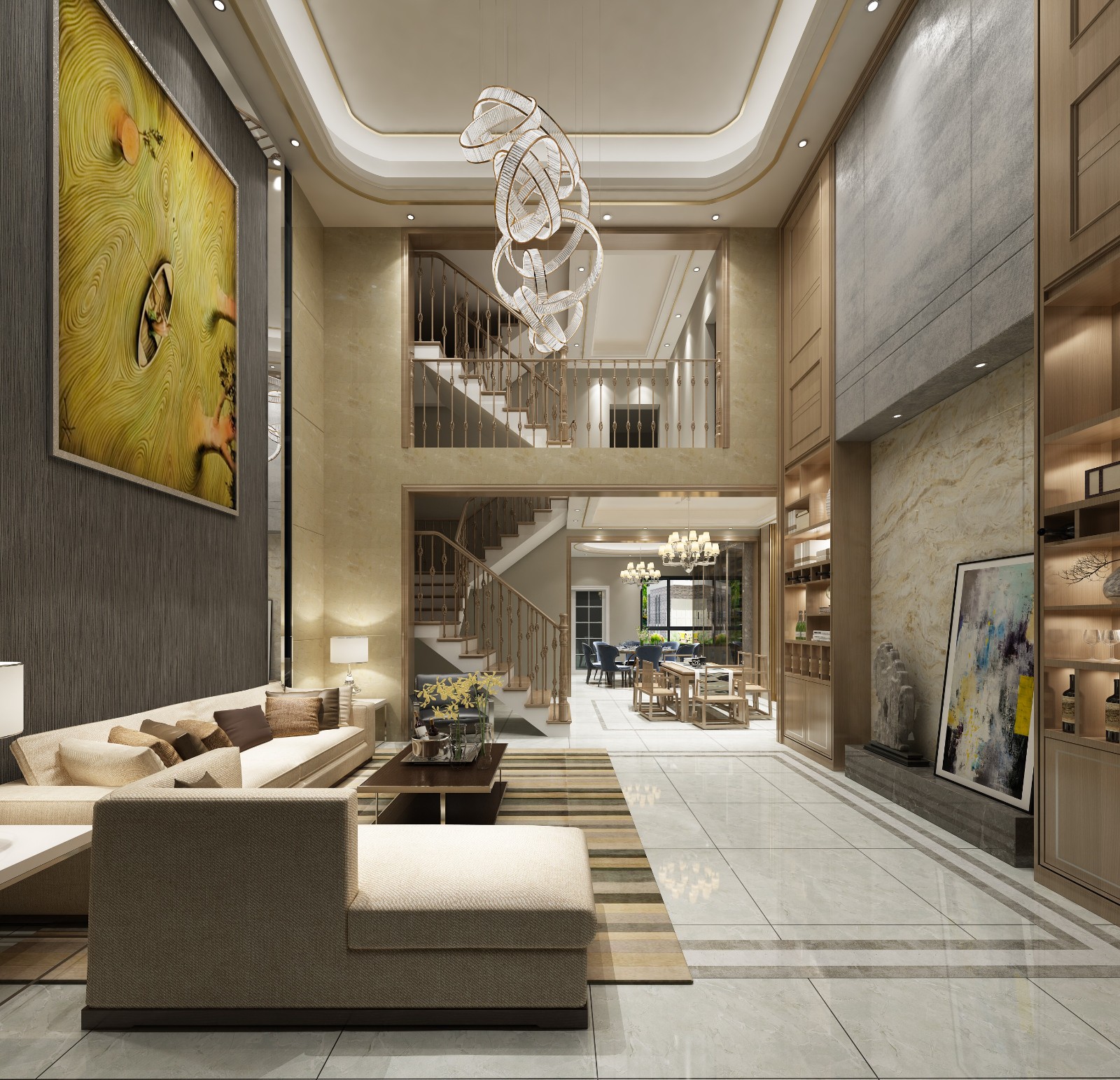 客厅以现代风格设计,参考港式设计灵感开始设计,以中空背景墙为背景设计收纳,挑空的大理石纹理。,后背以金属线条收边。