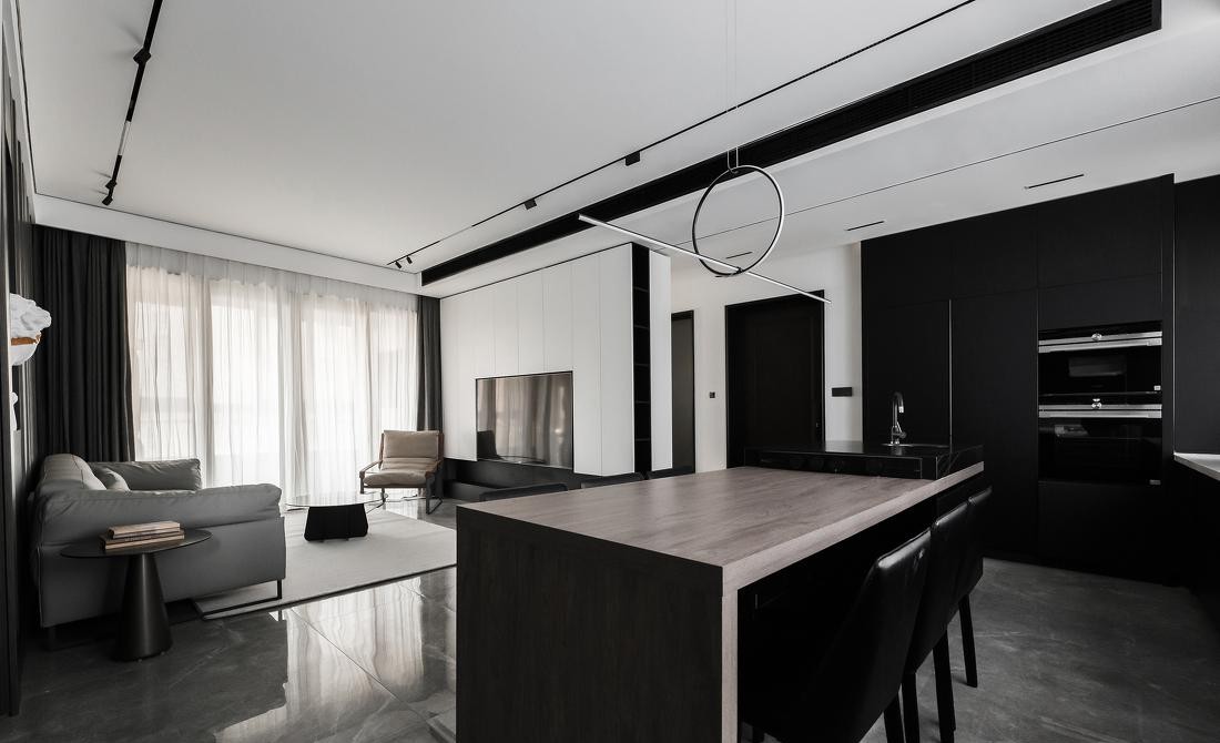 客厅黑白之间以灰色过渡,胡桃木色的餐桌和棕灰色的木饰面,让空间多了一份材质和色彩上的调和,让单调的黑白对比更有生机。