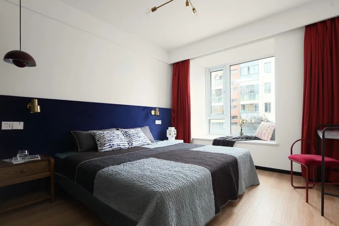 主人的床头墙是深蓝色的墙脚,搭配红色的窗帘,结合简约舒适的床单,营造出一种大胆的红蓝对比色空间感