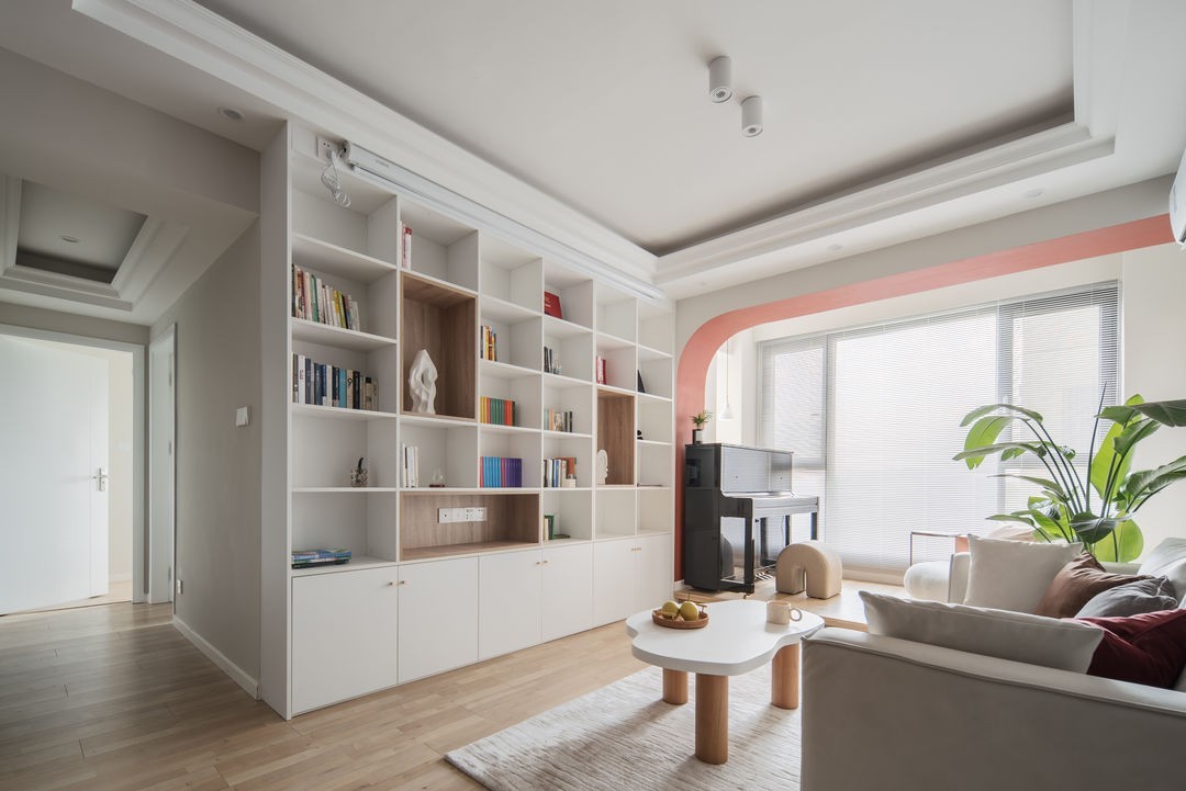 舍弃了传统电视机的传统客厅模式,平时客厅就是图书馆。开放式收纳设计出来可以当书柜以外还能顺便兼顾客厅的收纳任务。同时在书柜顶部外置壁挂投影幕布,观影阅读任意切换模式。