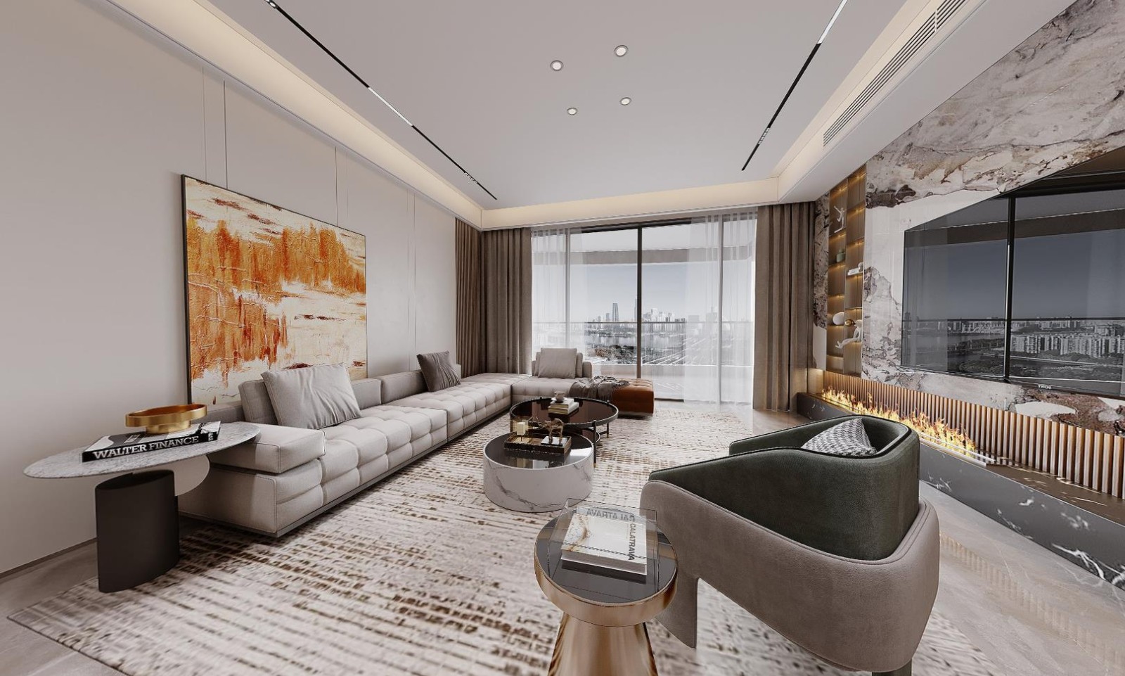 整个空间设计细节都经过慎重的推敲,简洁细致,突出材质和工艺的审美品质,回应居住者对品质的追求。电视背景墙面采用复合结构,最里面是整面的格栅设计,自然温润的木色包裹了整个空间,然后格栅上面再覆盖一小块浅棕色断层花纹的大理石电视背景墙,所有精巧设计隐藏于细节之中。既强化了空间秩序,又提升了空间气质,也满足了主人方便清洁的需求。设计师总是可以把舒适感和功能性把握得恰到好处。
