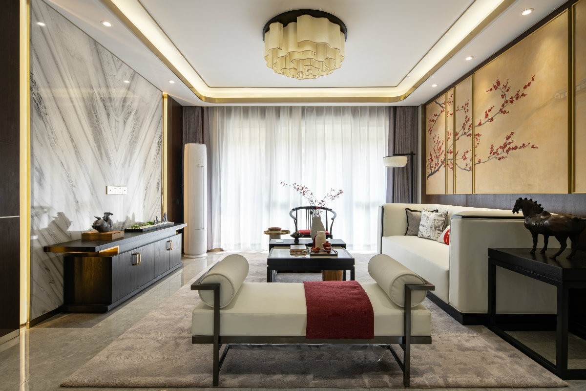 高峻【鸿楼装饰集团设计师】: [图片] 高峻【鸿楼装饰集团设计师】: 客厅雅正,沿用中式对称布局,盛开的红梅平衡了电视墙的肃穆。