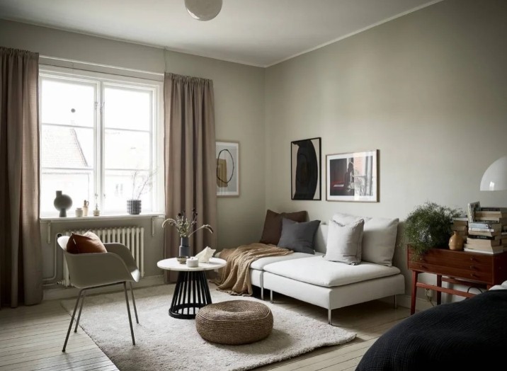 客厅放有绿植 榻榻米和米色窗帘是空间看起来更加温暖