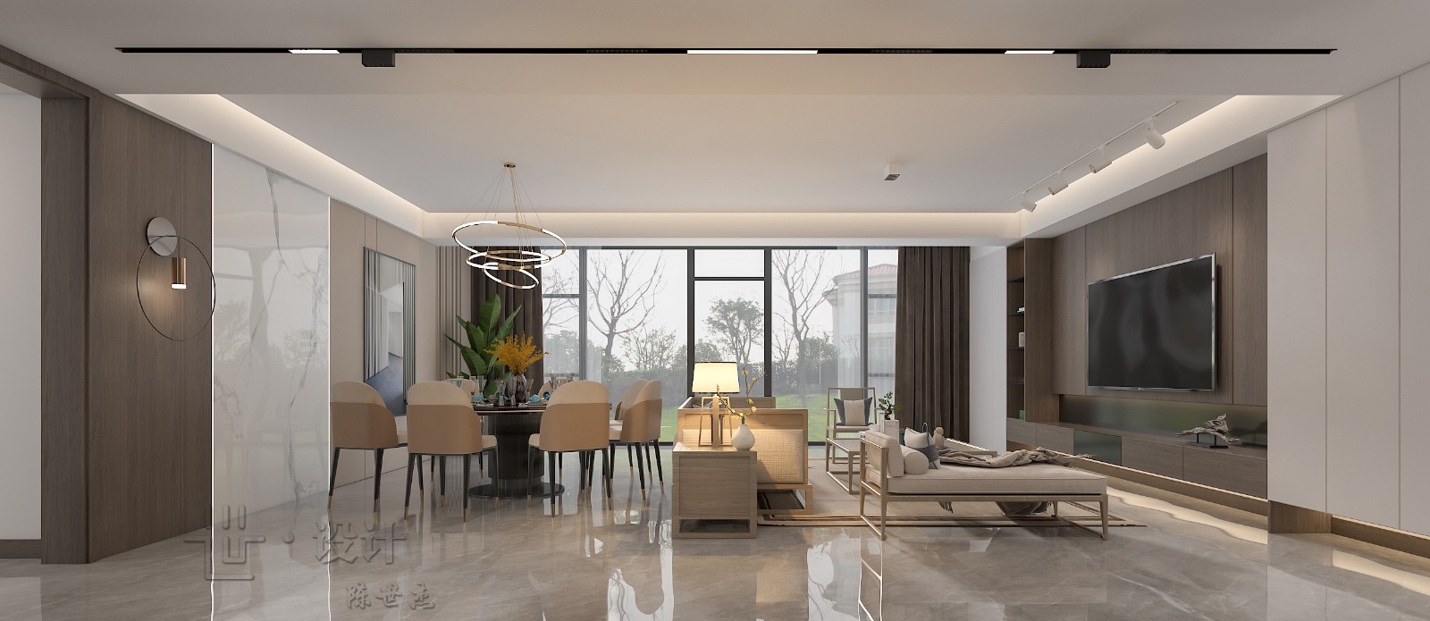 客餐厅为一体设计,加上顶上无主灯设计