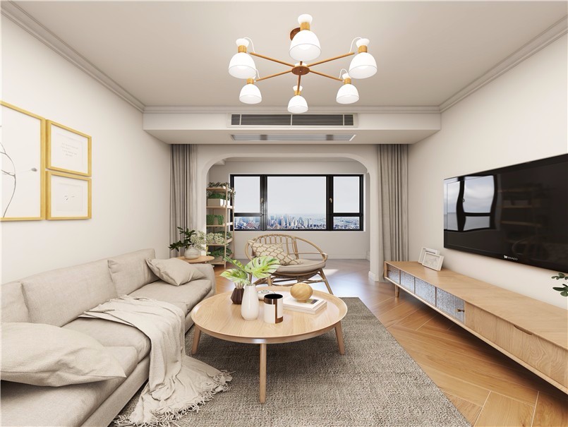 白色墙面为主,大量成品家具。考虑2.65米层高,业主要求中央空调,局部吊顶不显得压抑