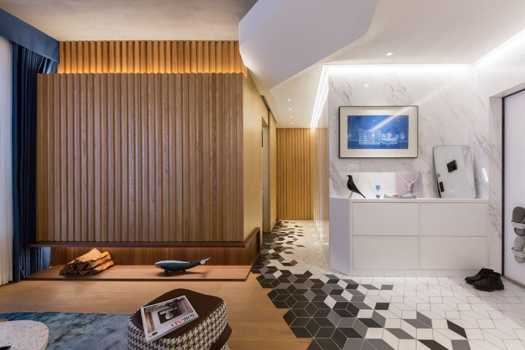 入户的玄关处铺贴了六边砖,和客厅的木地板混拼在一起,让整个空间看起来更加时尚,侧方悬空的鞋柜也能装下一些鞋子。