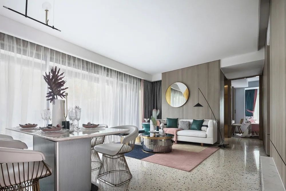 在这套94平米的装修案例中,整体空间以现代风格的设计基调,在家具方面加入金属、石材与木饰面的质感,让空间显得更加轻奢高档;而在家具软装上,则是引入了温馨舒适的北欧风配色,营造出一种华丽精致而舒适大气的居住氛围感。