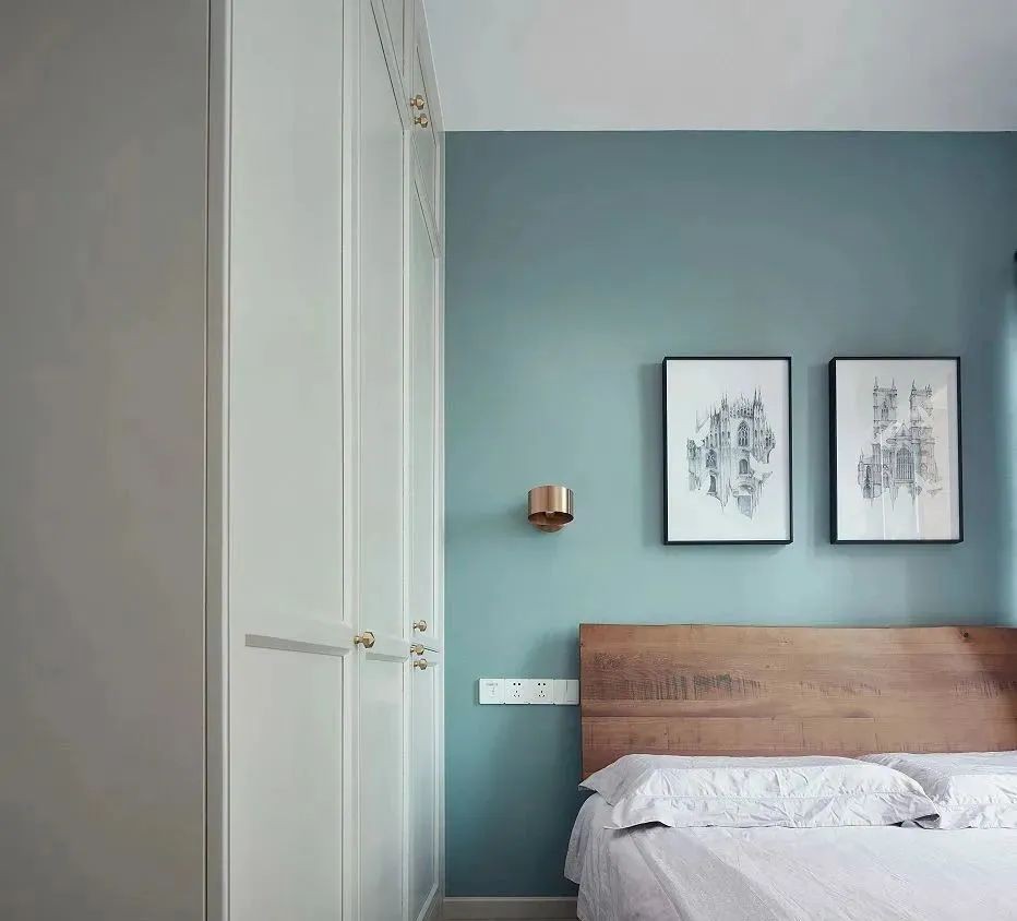 父母房陈设简单,湖蓝色背景墙搭配原木高背床,带来静谧安稳的氛围。