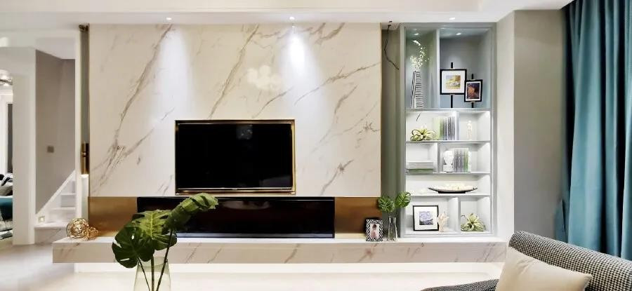 电视墙是大理石地台+背景墙的设计,右侧还加入了一个带灯带装饰的展示架,摆上装饰品与书籍,带来一个现代优雅的端庄与时尚氛围感。