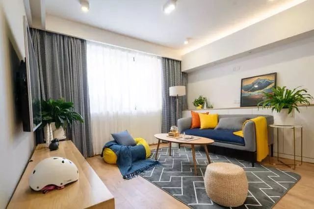 改造后的客厅,俨然一股文艺清新范,轻巧的家具组合取代了原有笨重的家具,让空间不沉闷。利用灯光设计,对客厅梁体进行弱化,规避厚重感。