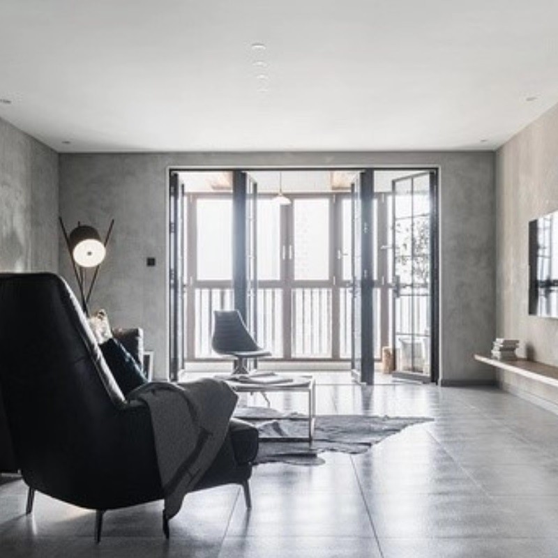 客厅四周墙面满刷了灰色水泥艺术漆,去掉了装饰画与其他墙面装饰,用大面积的留白去传达极简的状态,软装搭配的材质上以黑色真皮质感的家具为主,配上细线条的椅腿、茶几、落地灯等古铜色元素,去营造北欧工业风中稳重、大气的格调。