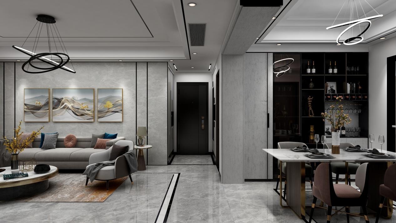 电视背景墙用了木饰面+大理石,并且木饰面区域做了隐形门,这样就不影响电视背景墙的整体性。