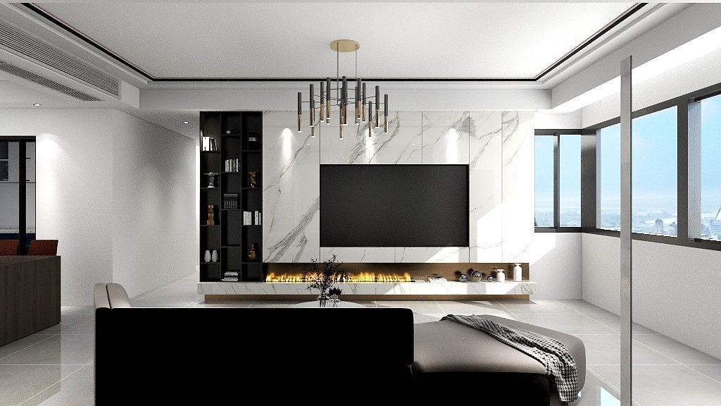 客厅客户比较喜欢现代轻奢的风格,电视背景墙用了岩板+壁炉+不锈钢书柜,顶面用了不锈钢走边。