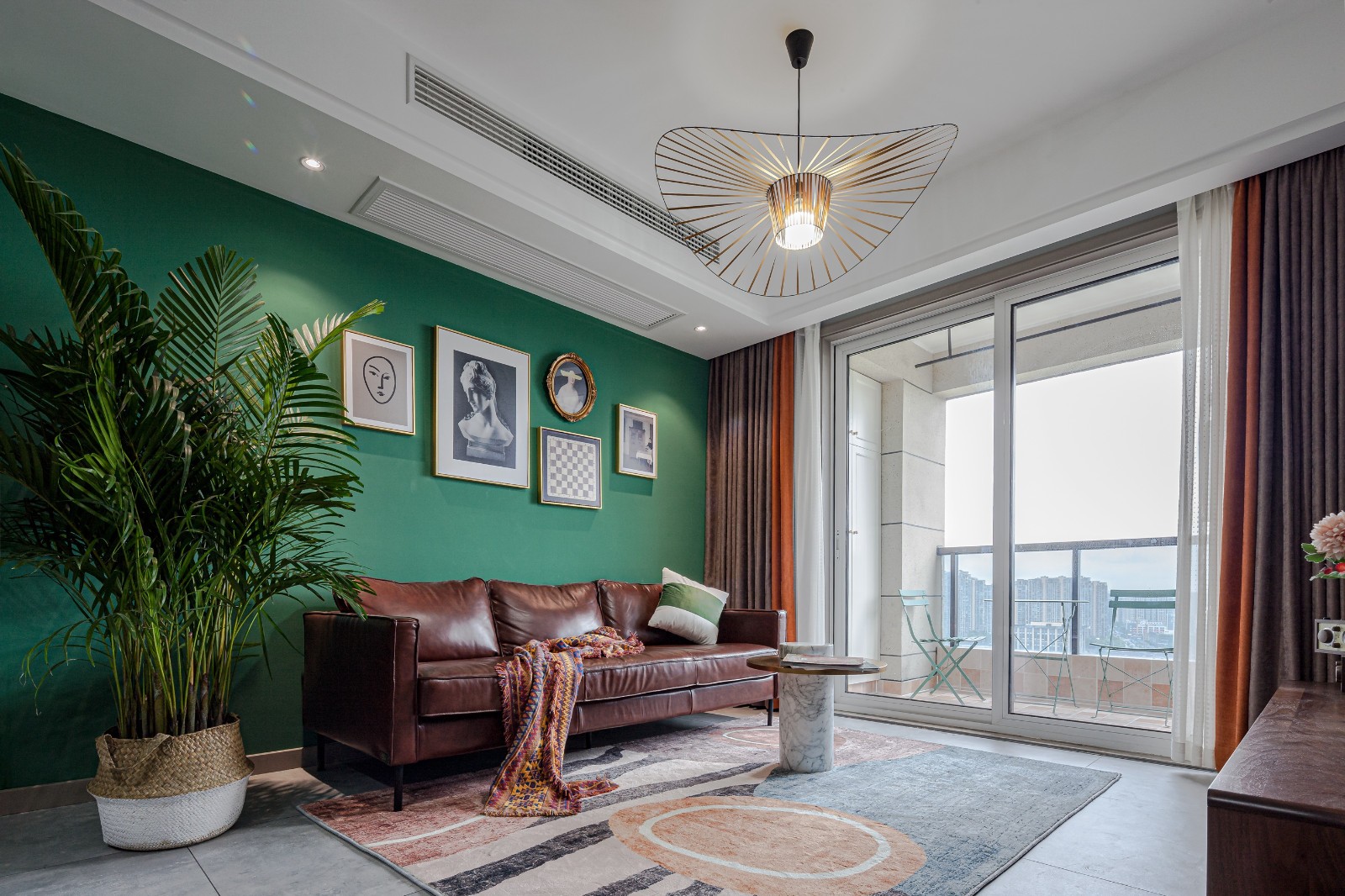 高纯度绿色乳胶漆背景墙,搭配复古棕皮质沙发,欧式古典金边装饰画不规则装饰,强有力的色彩表达之下,融入复古元素,别有一番味道。