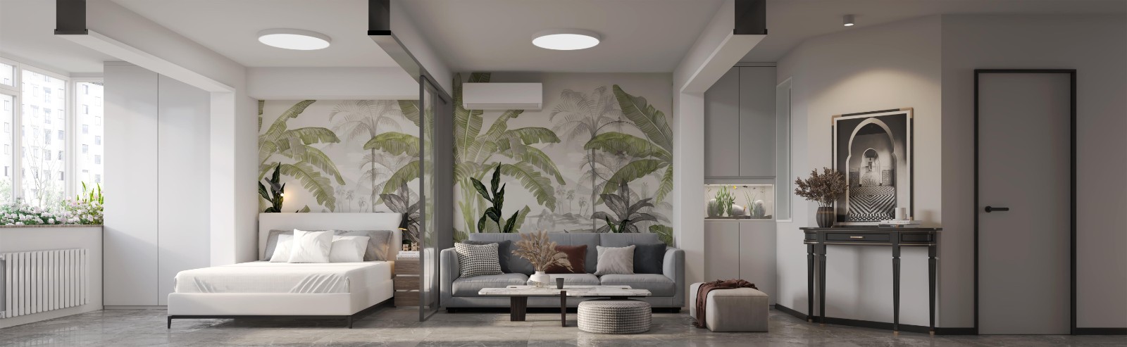 客厅隔出一间老人房和一间女儿房,老人房用玻璃隔断作为分隔,整体通透大气不影响采光,女儿房因为过道较长用了一小段斜墙,使过道缩短客厅更加开阔,沙发背景与卧室背景用绿植墙布,增加些许温馨氛围。
