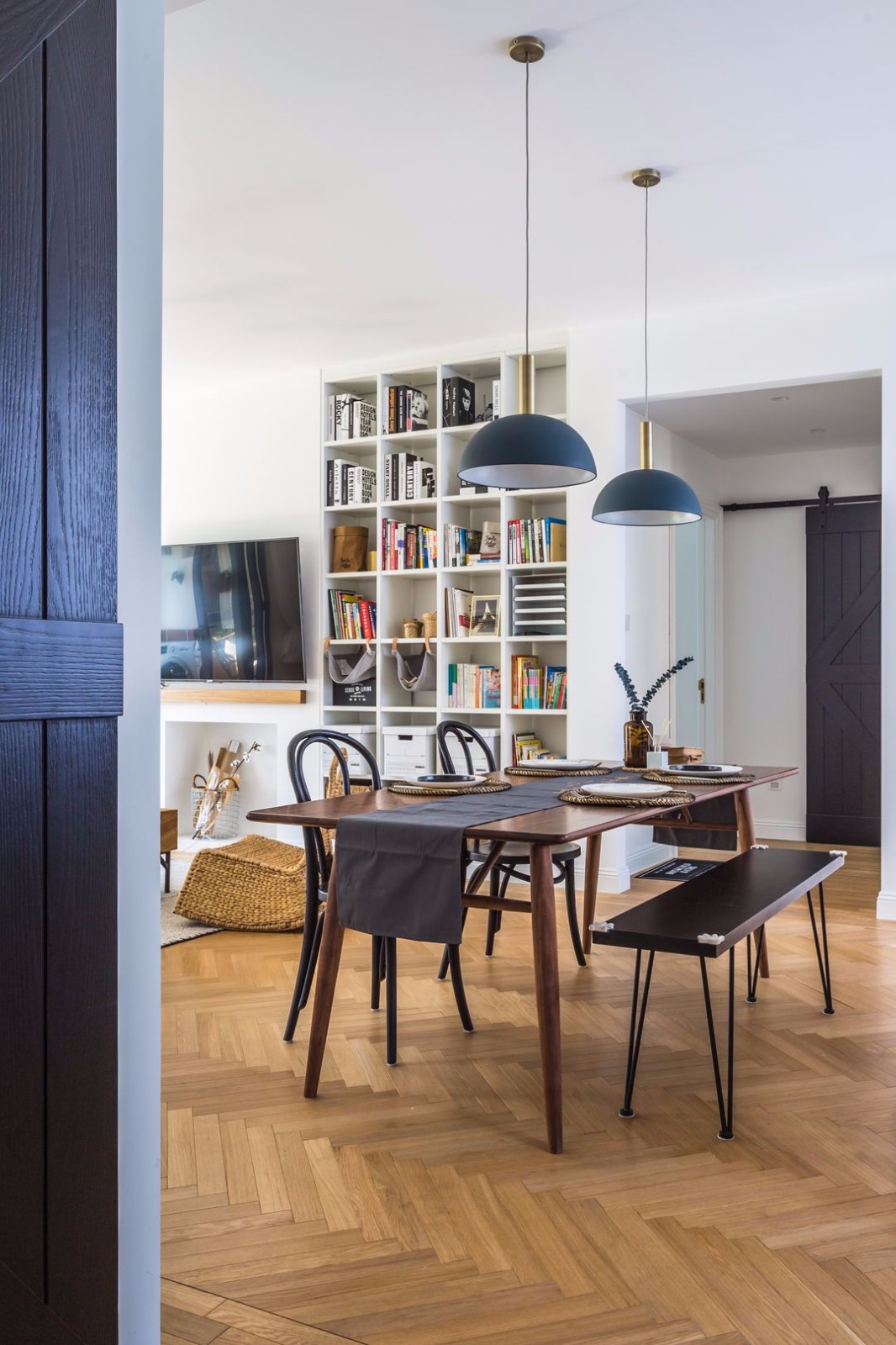 从玄关过来,***眼看到的就是这个角度,北欧闲适的浅白+木色空间背景上,深胡桃木色的餐桌椅将视觉点集中于此。