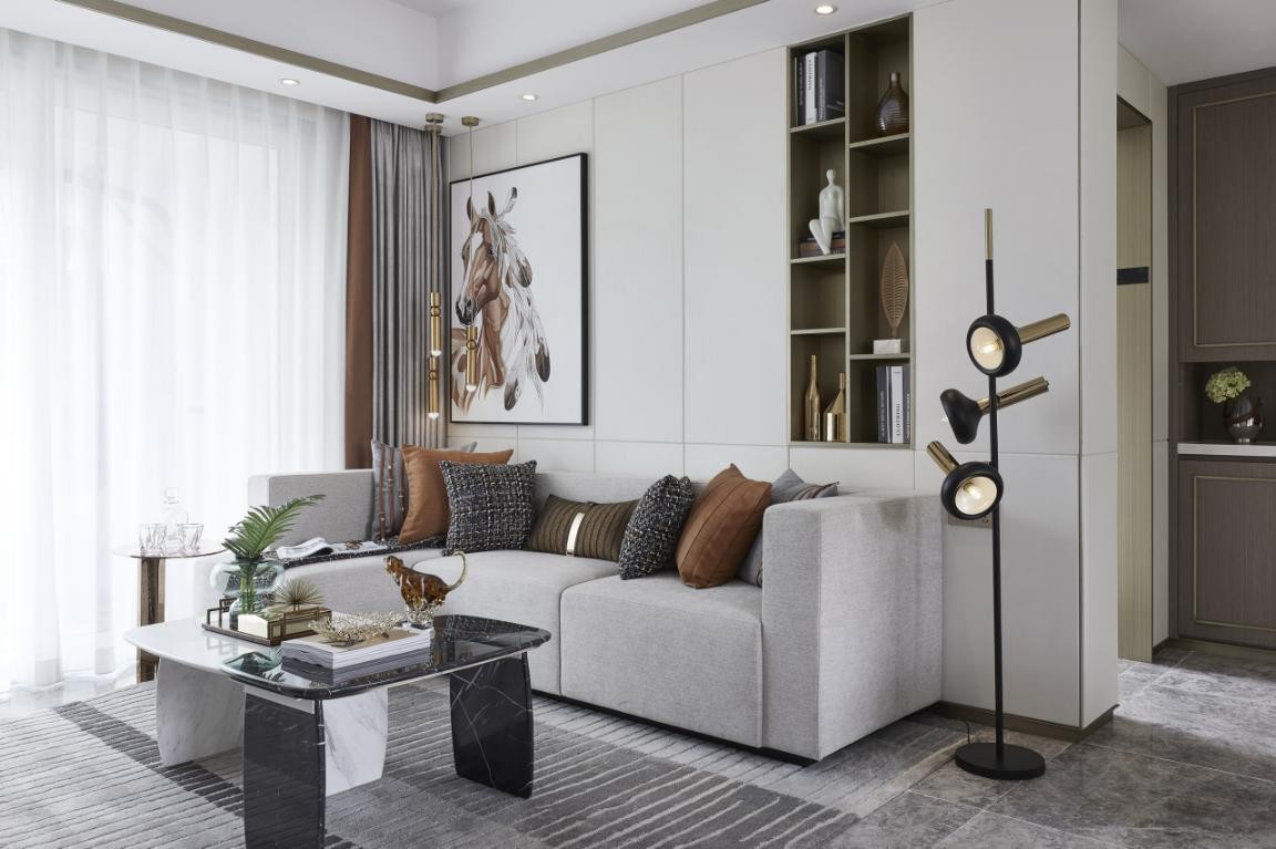 客厅在设计中,在原有硬装的灰色、米咖色的基调里加入高贵的橙色做渐变,让整个空间色彩丰富温馨治愈,材质上会用到水晶、布艺、大理石、金属、胡桃木去做一个融合和提升整体的品质感,在方法、材料层面拆解重组。