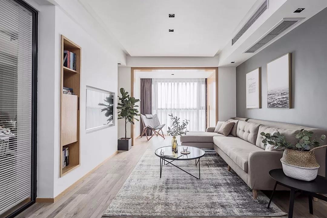 ▲清新干净的色调,让身体放松,工作的压力得到释放。 中央空调正对着沙发,让炎炎夏日不再闷热,既节省了安装空调的空间,又让客厅看起来简洁大方。 原木色的框区分客厅和阳台,使空间感更加强烈。