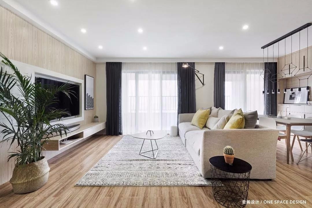 ▲客厅以原木色和米白色为基调,柔和的奶黄色作为空间的点缀,活跃空间气氛。线条轻盈的茶几边桌、简洁实用的电视背景墙,棉麻质感的暖色沙发,自由生长的绿色植物,家的暖意,油然而生。