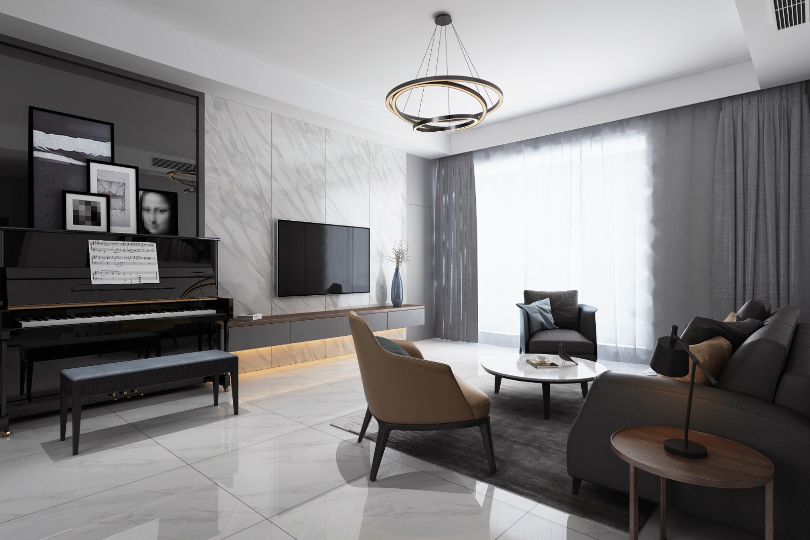 为了满足客户的极简审美,我们在颜值上下足了功夫,墙面地面采用浅色的大理石,天花采用简约的局部吊顶,再配以中央空调简直太好用了。另外在客厅摆上钢琴,让业主与朋友在聚会时来一场音乐盛宴。餐厅区域采用的吊灯,在简约中不失柔和。