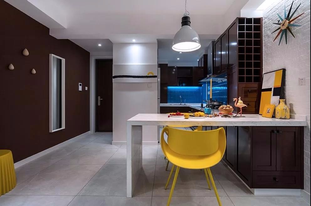 厨房:深褐色橱柜与海蓝色厨房墙砖的对比,增添整个空间沉静、内敛之感且个性十足。在这样的厨房天地里烹制美食别有一番惬意。