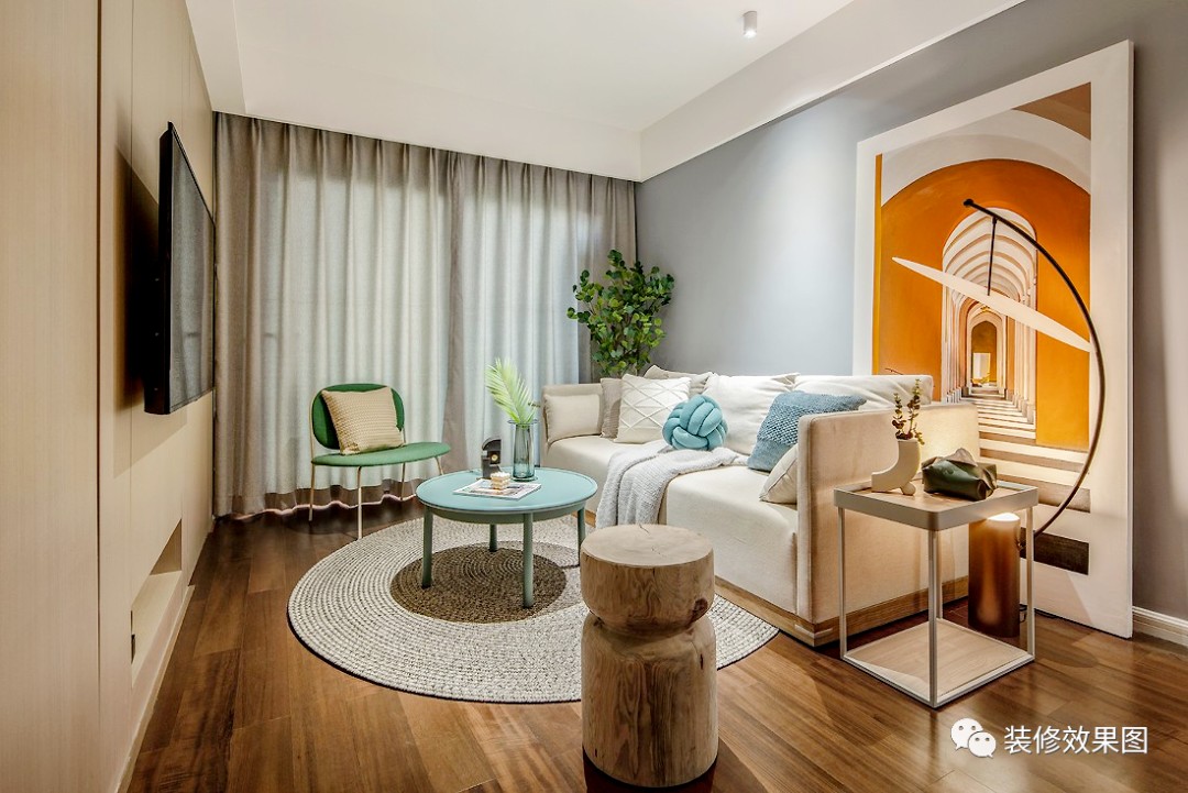 沙发背景墙做了4公分的叠级走边,墙面采用了灰色的乳胶漆,刚好在顶上和墙面上做了区分,使空间层次感更为分明。
