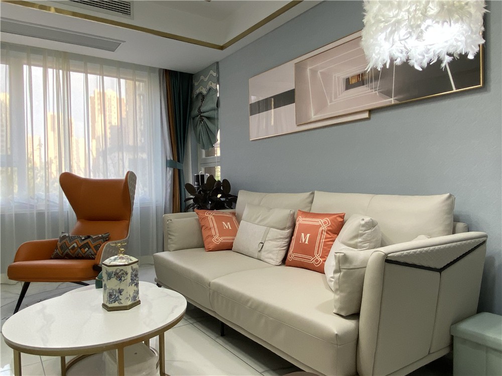 地面通铺大地砖,***限度的延伸视觉感,雾霾蓝的沙发背景墙漆搭配皮质沙发,爱马仕橙的单椅及圆形岩板茶几无不呼应方案中的轻奢质感。