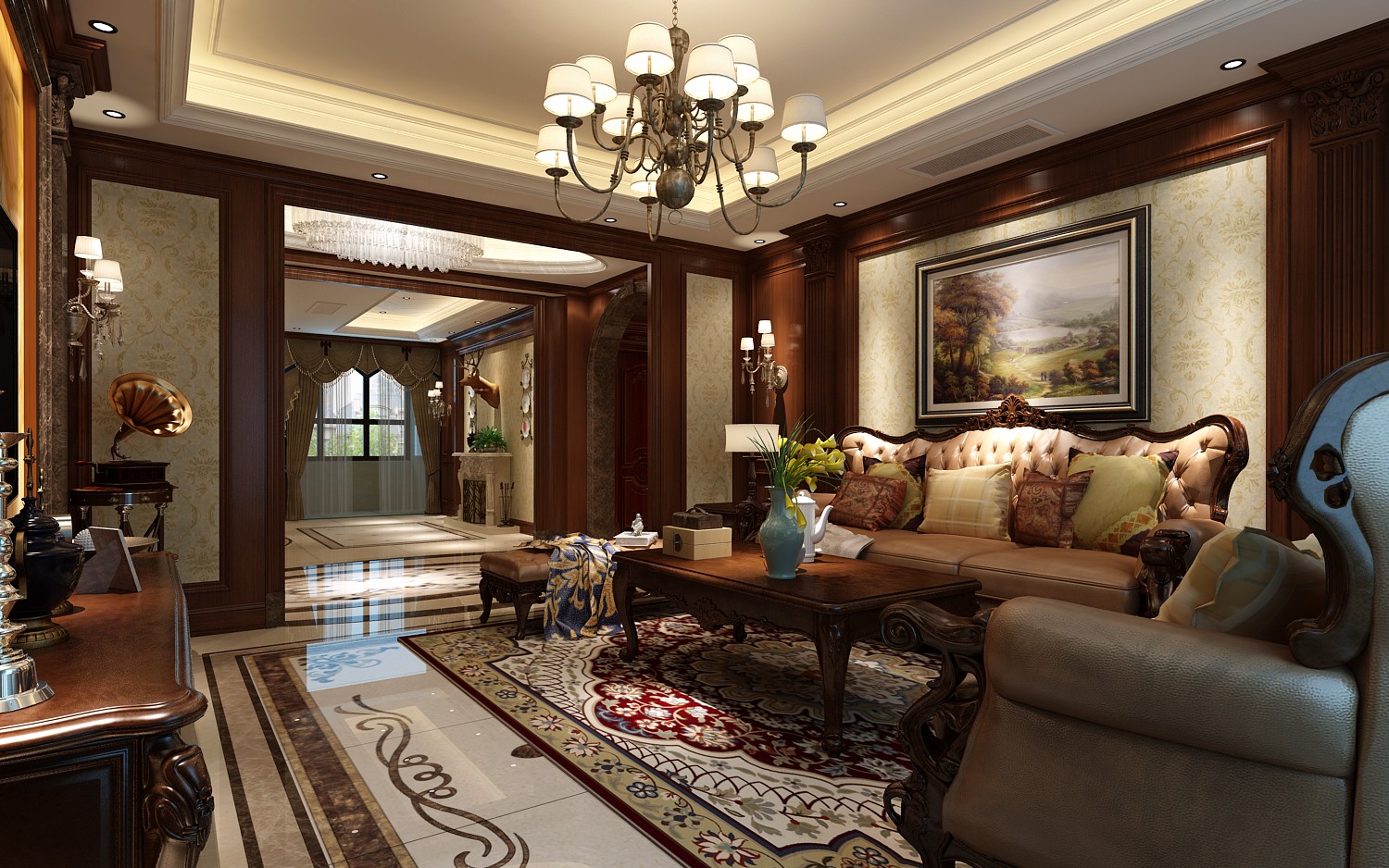 时尚与古典并存,文化与美互不排斥,浅色大花纹壁纸结合红棕色墙面护墙板和线条使整个客厅特别有层次感。
