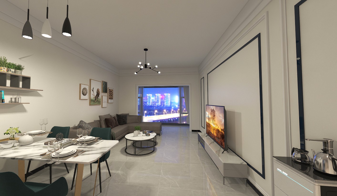 客厅过长,简单挂镜线修饰阴角,搭配简约背景墙做出租房。