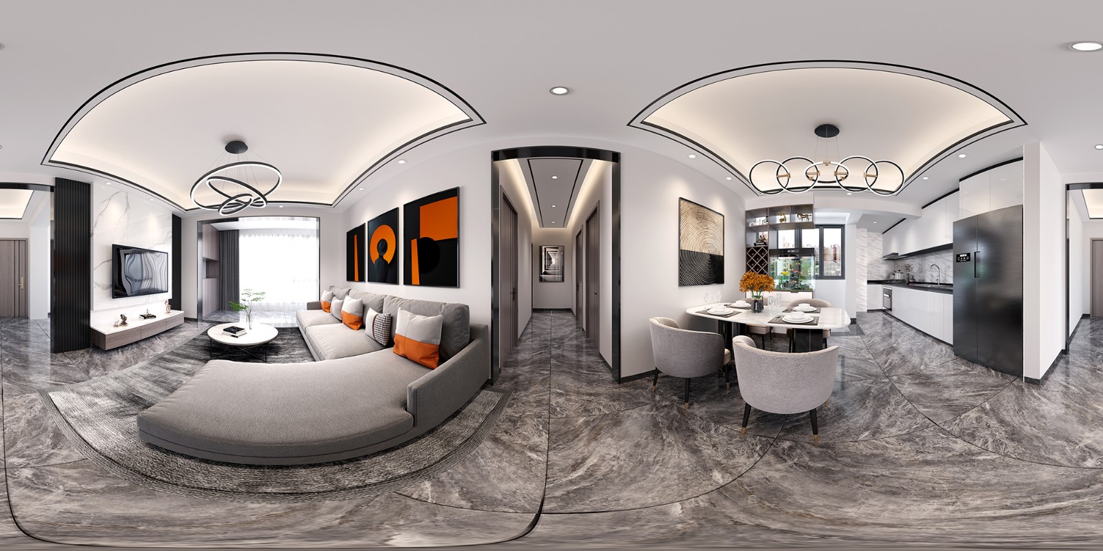 黑白灰的后现代简约风格客厅是当下很受人们欢迎的一种设计搭配,或白或灰的色调,让客厅显得既沉稳而又不失时尚。白色的墙面、灰色的家具和沙发,让客厅看上去格外简洁开阔。再加以暗橙色的小跳色,无须华丽的装饰,无须贵重的家具,简单的颜色搭配带来的明媚感将整个客厅的拘谨一扫而空。
