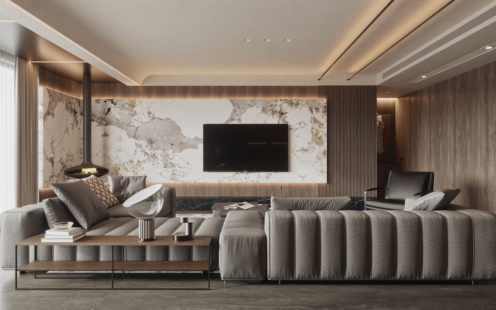 卧室用轻盈悬空的木与沉稳厚实的大理石, 制造视觉冲击与美***衡,重新定义了空间结构的形式。 线与面在空间中或平行,或交错,或对比, 带领居住者深入探究空间的归属感与价值感。