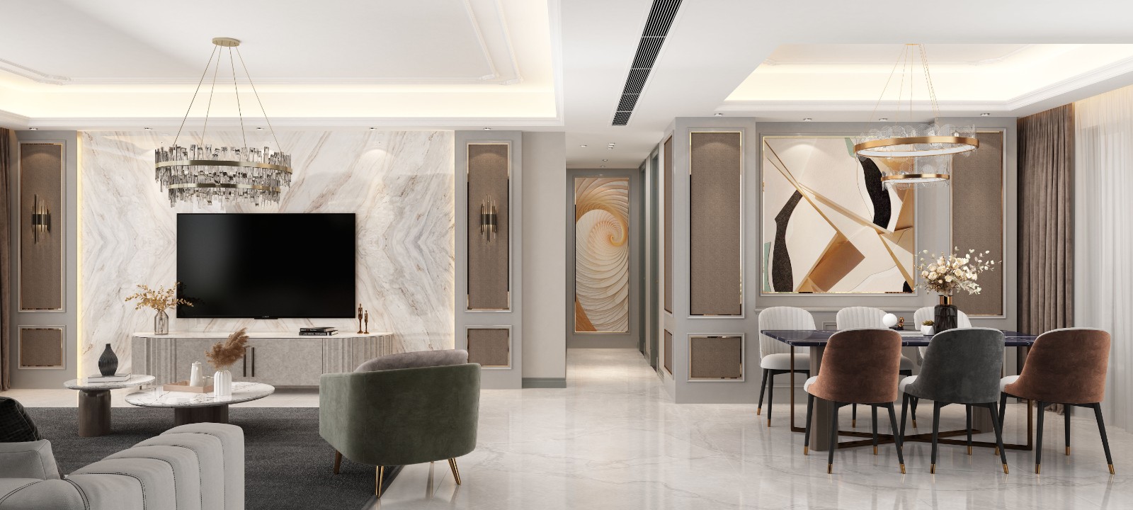入户玄关拱形的石膏线条与大理石结合,米色的主色调搭配绿色,显得整个空间清新自然,又不失格调。
