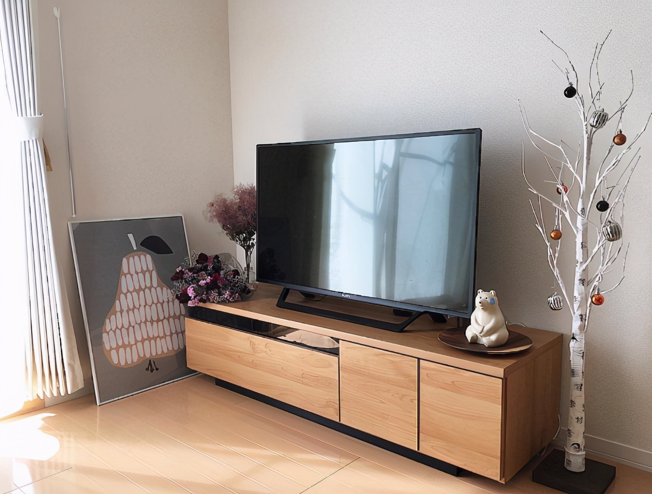 电视墙放空,两边用装饰画和小灯点缀,看起来温馨多了。