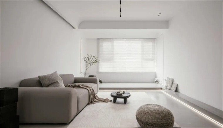 客厅,水泥色自流平地面,搭配无主灯顶面,沙发上方的墙面增加弧面设计,电视墙延伸至靠窗区,增高地台加入灯光效果