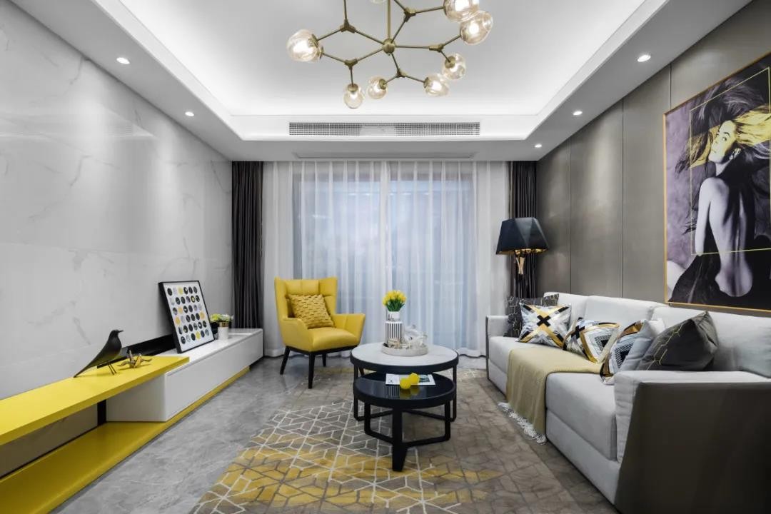 在这套90平米的现代风格装修中,整体空间以灰色调的设计为主,并在家具细节处加入黄色的点缀装饰,整体简约而舒适的软装布置,营造出一种现代优雅的居住氛围感。