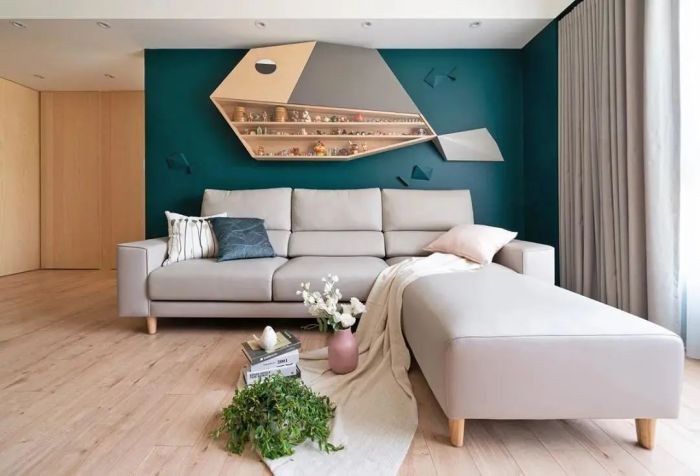 客厅的沙发背景墙做了孔雀蓝,以蓝色为基础,对面的电视背景墙及收纳柜都做了相近的颜色来衬托,同时也成为整个空间的亮色部分。