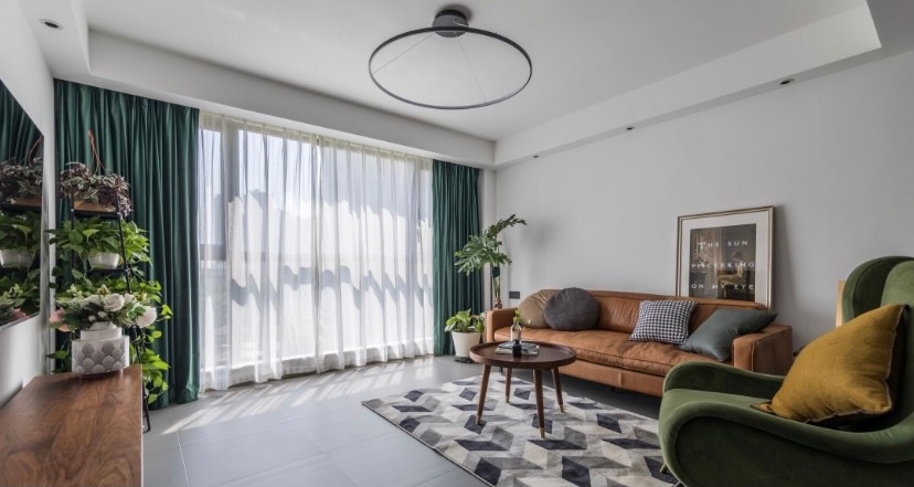 步入客厅,感官便自然而然地沉浸在清新治愈的色彩情绪里。清新绿+暖调棕温柔调和出一个“室内森林氧吧”。