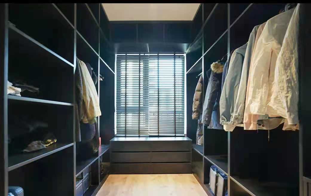 黑色系衣帽间采用了U形布局,保证了动线合理的同时也具备强大的收纳功能