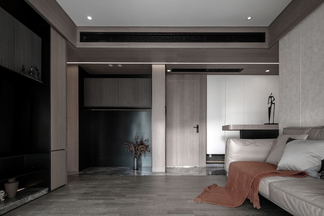 开放式的客厅,与吧台、餐厅相连。客厅用木色对空间进行主基调铺陈,大大的推拉门将日光释放进敞朗居室,阳光充沛。