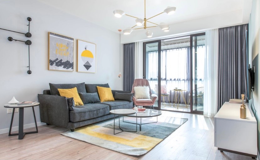 客厅空间也维持着清爽舒适的感觉,沙发背景墙使用了淡淡的浅蓝色进行空间色调烘托,整个空间,只有抱枕地毯和挂画的黄色进行跳色对比