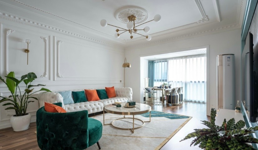 整体设计以白色为主,搭配墨绿和橙黄的撞色,再用家具的金色点缀,营造出很有质感品位的氛围。搭配的家具选择上要更加中式造型和材质,比如说白色沙发,是皮质的,而且造型也是比较有品位的。