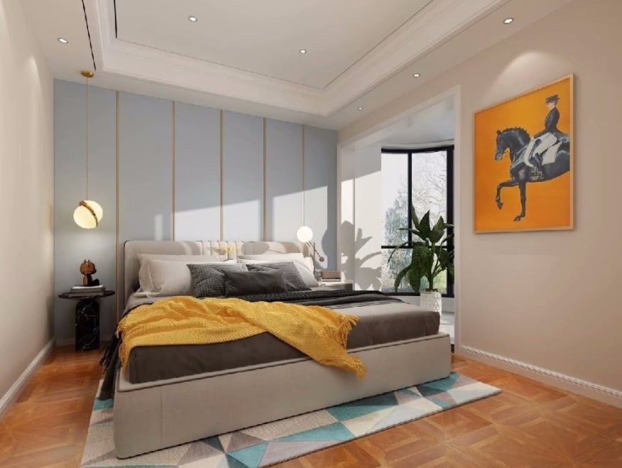 卧室空间:利用后面背景墙的跳色处理,给小面积的卧室延伸的空间